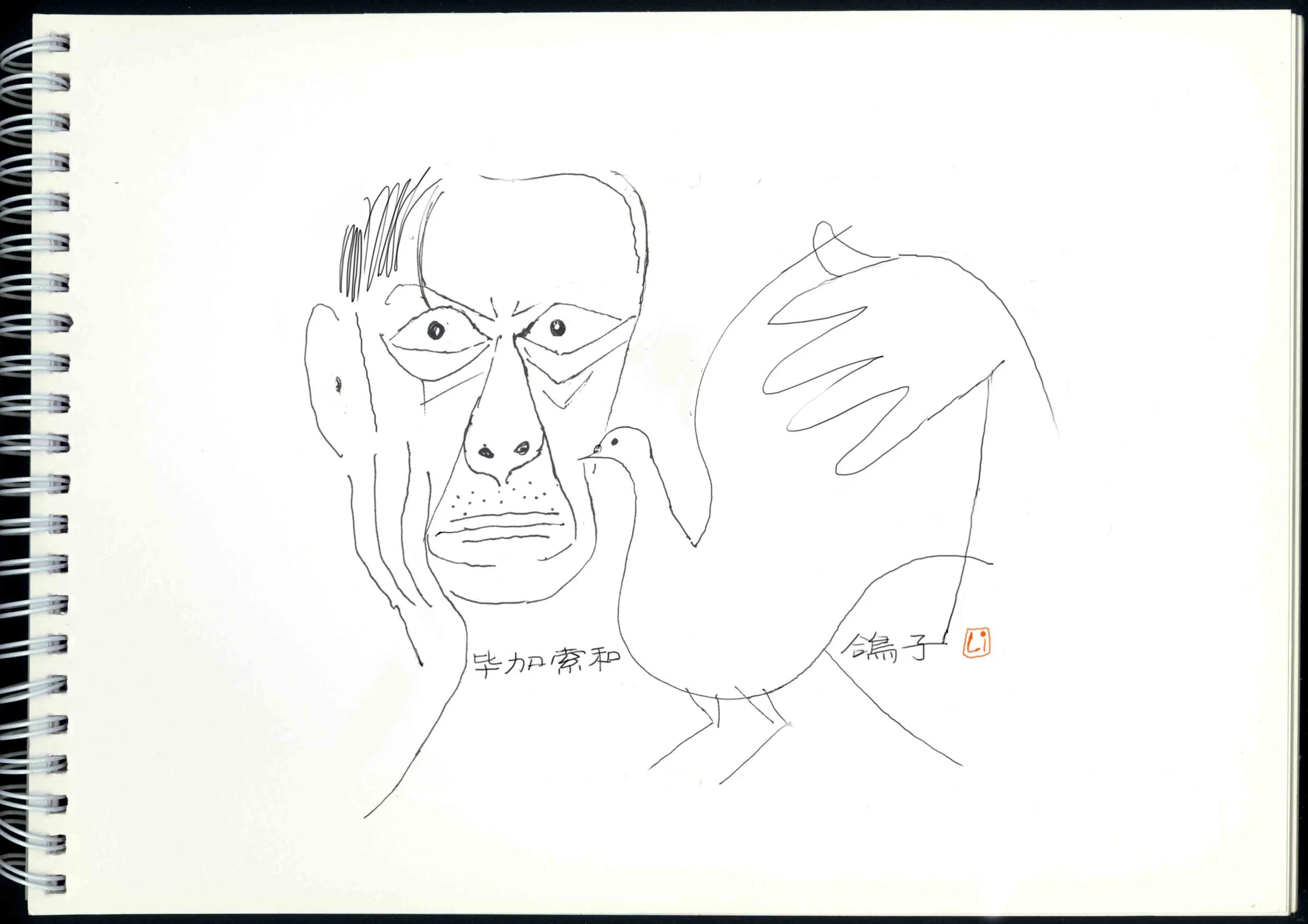 《禅师与少女·毕加索与鸽子》草图,纸本钢笔,尺寸不详,2002年